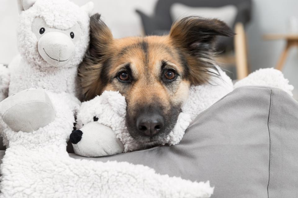 Blød og miljøvenlig bamse i genbrugsplys – perfekt som legekammerat til hunde.