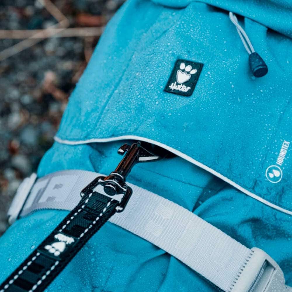 Hurtta Monsoon Frakke – Blå til hunden du gerne vil holde tør og forholdsvis ren, på jeres gåtur i regn, slud, blæsevejr og mudder? Så har Hurtta designet denne nye og utrolig funktionelle regnjakke. Den grå krave, som du kan se på billederne, kan trækkes helt sammen med en elastiksnor, så vandet ikke trænger ind under jakken. Den behagelige bløde krave kan strammes op omkring hundens hals, for at beskytte bryst og nakkeområdet.